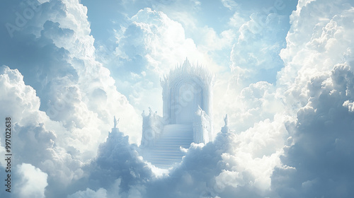 W chmurach unosi się piękny, biały tron, który wydaje się być władcą niebiańskiego królestwa.