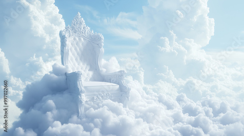W chmurach unosi się piękny, biały tron, który wydaje się być władcą niebiańskiego królestwa.