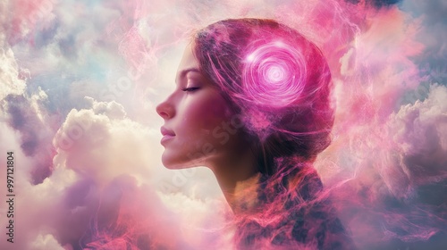 Spiritual woman, pink color cloud, life time and eternity, intersection of astral body energy field, supernatural frequency senses, consciousness healing