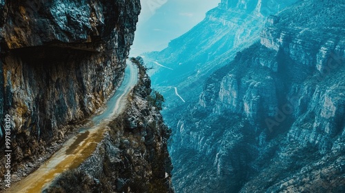 A narrow mountain road carved into the side of a cliff, with breathtaking views of the valley far below.