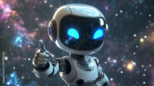 Uroczy robot z szerokim uśmiechem i jasnymi, błyszczącymi oczami wskazuje w stronę kosmosu.
