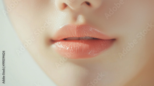 若いアジア人女性の唇のクローズアップ。ナチュラルな桜ピンク色の口紅を付けている可愛い口元。