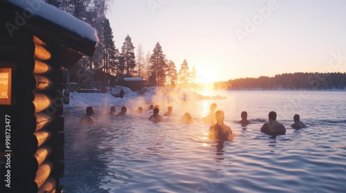Traditional finnish sauna experience by a winter lake sunset for relaxation and rejuvenation