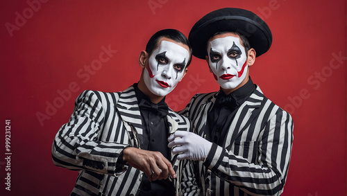 Two mimes in black and white striped suits pose together against a red background, showcasing expressive face paint and coordinated costumes.