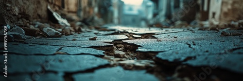 Earthquake Damage Close-Up, highlighting structural cracks in a building, capturing the intensity of seismic events and their impact on architecture
