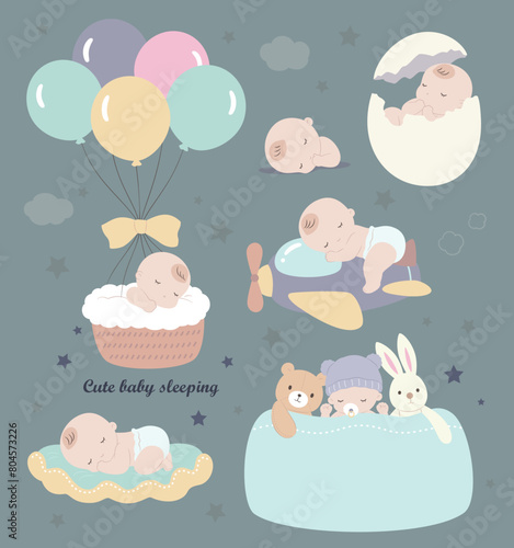 Various scenes of babies sleeping, such as balloons, airplanes, eggshells, etc.