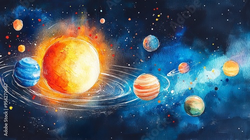 Colorful watercolor depiction of the solar system with planets and sun
