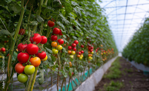 Rows of vibrant red and green tomatoes growing on vines inside a large greenhouse.
