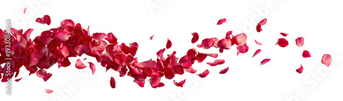 Flying red rose petals in dynamic wave, isolated on transparent cutout background