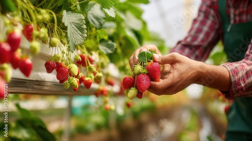 Farmer harvesting ripe red strawberries from plants in a greenhouse on a sunny day