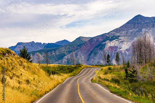 Scenic Road Through Waterton Alberta Canada With Majestic Mountain Views And Lush Green Landscape