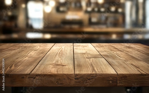 Empty wooden table in blurry cafe background.