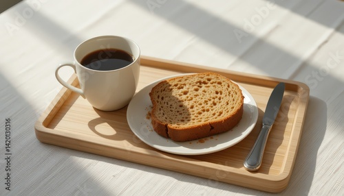 Breakfast With Black Coffee and Toasted Bread on a Wooden Tray in Soft Morning Light