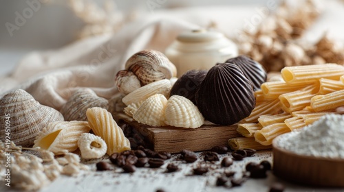 Artistic arrangement of pasta, chocolate shells, and coffee beans on rustic surface