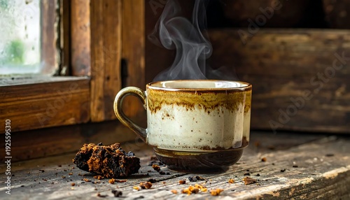 Steaming Hot Coffee Cup on Rustic Wooden Surface with Window View.
