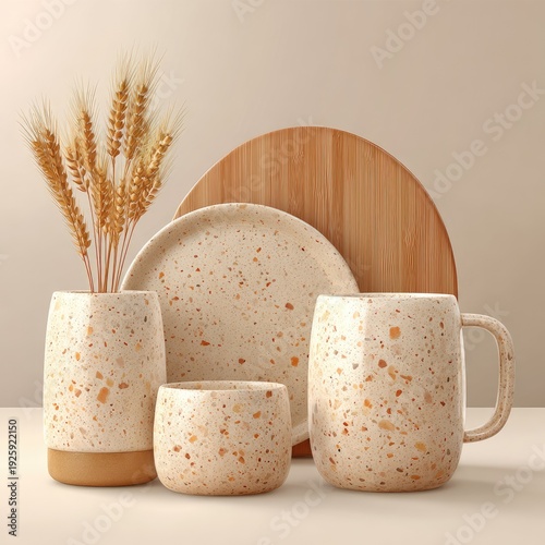 Ceramic tableware with wheat, against soft neutral backdrop