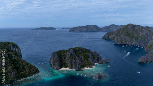 Drone aerial view of Shimizu Island in El Nido, Palawan, Philippines. Tour A route and Place.