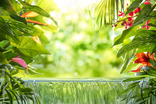 Tropical palm leaves,flower and small waterfall