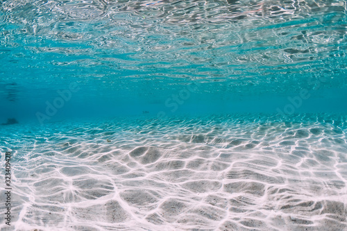 Turquoise ocean water with sandy bottom underwater.