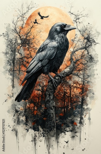 A majestic black crow perched on a leafless tree branch against a vibrant orange moonlit autumn forest backdrop.