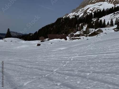 Wonderful winter hiking trails and traces on the fresh alpine snow cover of the Bernese Oberland region, Switzerland - Herrliche Winterwanderwege und Spuren auf der frischen Schneedecke, Schweiz