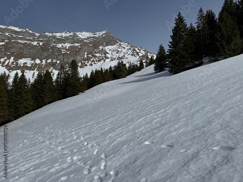 Wonderful winter hiking trails and traces on the fresh alpine snow cover of the Bernese Oberland region, Switzerland - Herrliche Winterwanderwege und Spuren auf der frischen Schneedecke, Schweiz