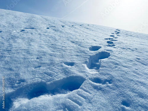 Wonderful winter hiking trails and traces on the fresh alpine snow cover of the Bernese Oberland region, Switzerland - Herrliche Winterwanderwege und Spuren auf der frischen Schneedecke, Schweiz