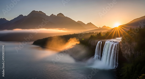 Dramatic waterfall cascading near majestic mountains at golden hour on transparent background