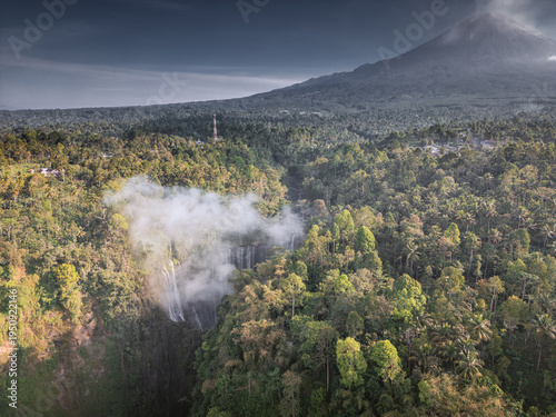 Aerial view of the scenic and incredible Tumpak Sewu waterfall at sunrise time with Semeru Volcano at the background - Pronojiwo, East Java - Indonesia