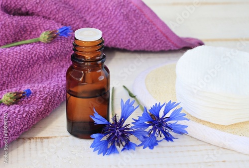 Herbal essence. Cornflower tincture, dark glass apothecary bottle, towel, cotton pads, fresh blue flower. Natural skin treatment.