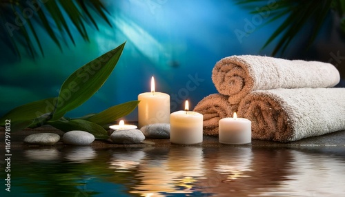 Serene Spa Retreat: Bamboo, Waterfall, Candles, and Towels Reflection