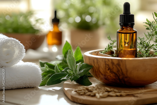 Essential Oil Drops in Wooden Bowl with Herbs