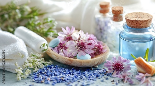 Serene Spa Setting with Fresh Lavender and Aromatherapy Oils for Relaxation and Wellbeing : Generative AI