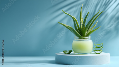 Fresh Aloe Vera Gel and Plant on Blue Pedestal with Palm Shadow