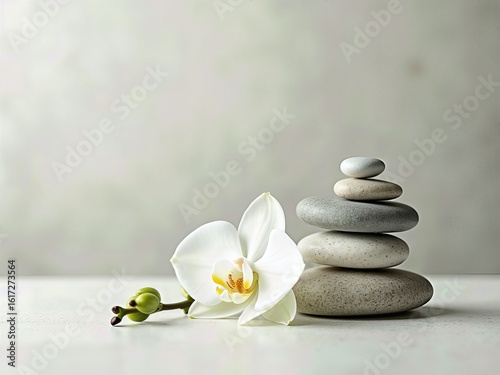 Harmony in Still Life, Serene Orchid Blossom and Balanced Stones evoking tranquility and peacefulness in a zen-like composition