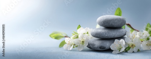The serene stacked stones adorned with delicate flowers on a soft background.