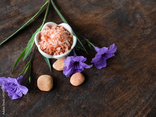 Himalaya Salt in Cup with Pebble and purple Flowers on Wooden Table Background,Aroma Therapy Massage Spa Set.