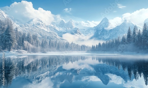 Landscape of a winter lake, mountains and forest. Beautiful winter lake against the background of forest, snowdrifts, high mountains, blue sky and large clouds