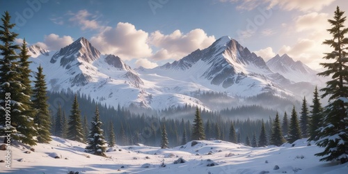 A soft, cloudy sky casts a serene light on the snow-covered mountains and evergreen trees, serene landscape, natural scenery, snow-covered mountains
