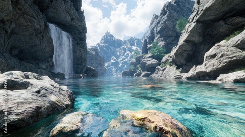 Mountain gorge waterfall serene lake background
