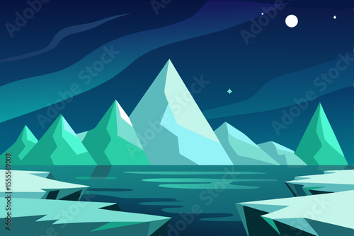 Vector illustration of a serene winter mountain landscape under a moonlit sky, featuring snow-capped peaks and ice, with an ocean sailboat traveling through blue water