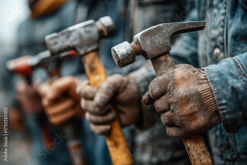 Close Up of Dusty Worker's Hands Holding Hammer in Row Against Blurry Background