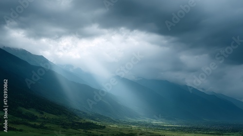 #214733239View from Gorvashi pass on a hiking trail covered in clouds and leading from Ushguli to Chvelpi, Caucasus mountains, Georgia