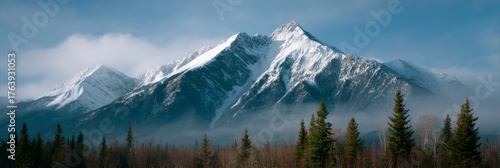 A soft, cloudy sky casts a serene light on the snow-covered mountains and evergreen trees, serene landscape, natural scenery, snow-covered mountains