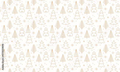 Seamless winter background pattern with linear Christmas trees and snowflakes.