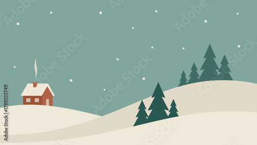 Minimalistic night winter landscape in Scandinavian style. Vector art of house in snow. Hand drawn original illustration for festive Christmas cards.