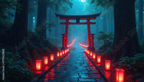 Red torii gate and glowing lanterns line a wet stone path in a foggy Japanese forest at night. Rain falls on trees surrounding the mystical illuminated walkway. Serene scene.