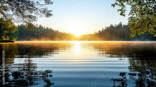 Warm pastel dawn over peaceful lake with misty forest reflection