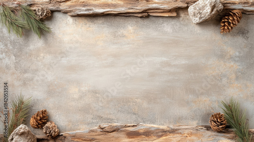 Rustic driftwood pinecone pine branch textured background cozy neutral tones