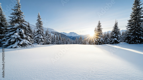 Snowy pine forest sunrise with smooth untouched snow and warm sunlight
